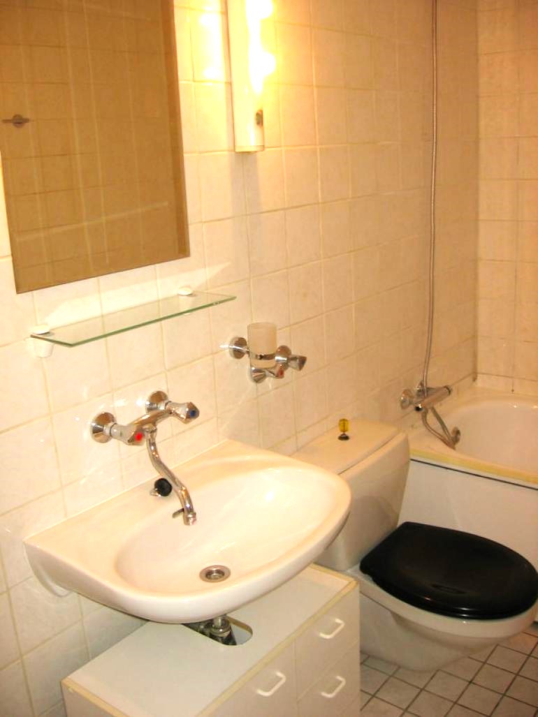 1 slaapkamer (10 m2). Fijne badkamer met toilet, ligbad/douche, wastafel en wasmachine-aansluiting.