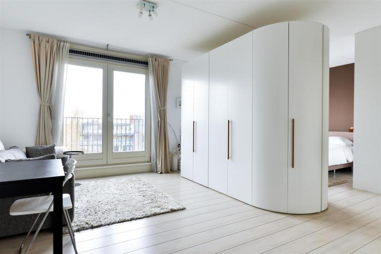 Indeling: Ruime hal met luxe toiletruimte met hangend sanitair. Vervolgens de woonkamer en slaapkamer die door een handige en fraaie designkast van elkaar gescheiden.