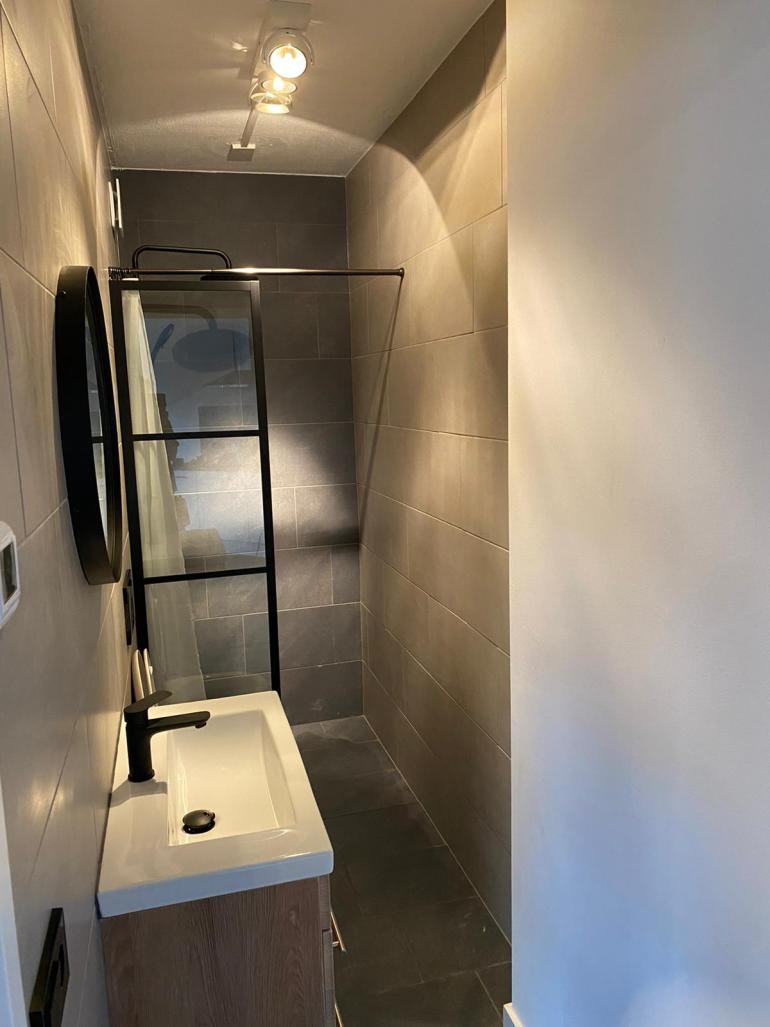 Moderne en nieuwe badkamer, ook met vloerverwarming, voorzien van wastafel, toilet en inloopdouche.